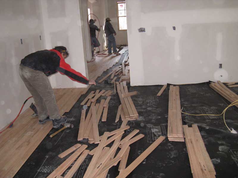 Hardwood flooring goes in. The camera is in the kitchen, looking toward the front of the house.
